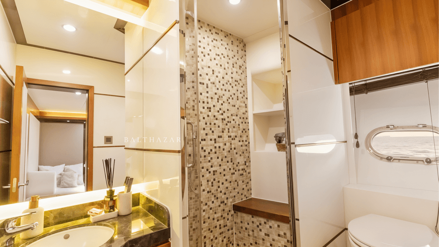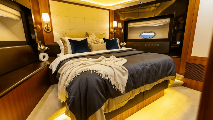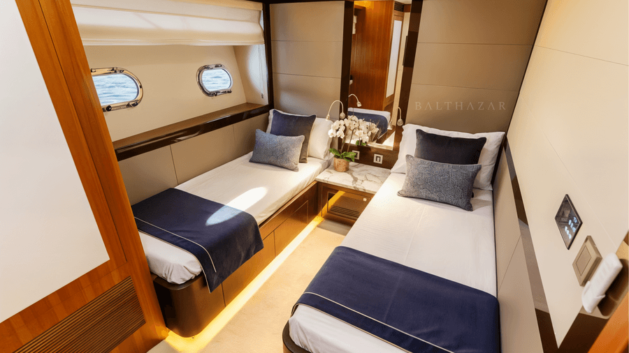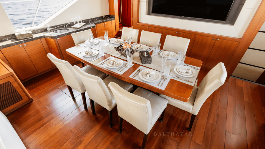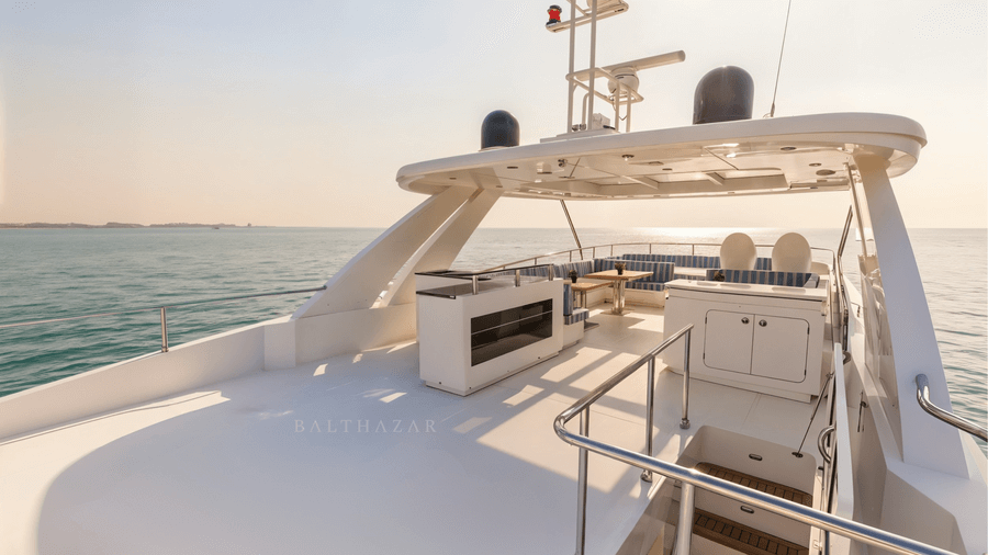 Her flybridge stands as a highlight. She has an expansive sanctuary for entertainment, dining, and sun-soaked relaxation, framed by panoramic ocean views. At the bow, a spacious front-deck seating area provides an intimate escape for sunset moments or tranquil morning coffees.