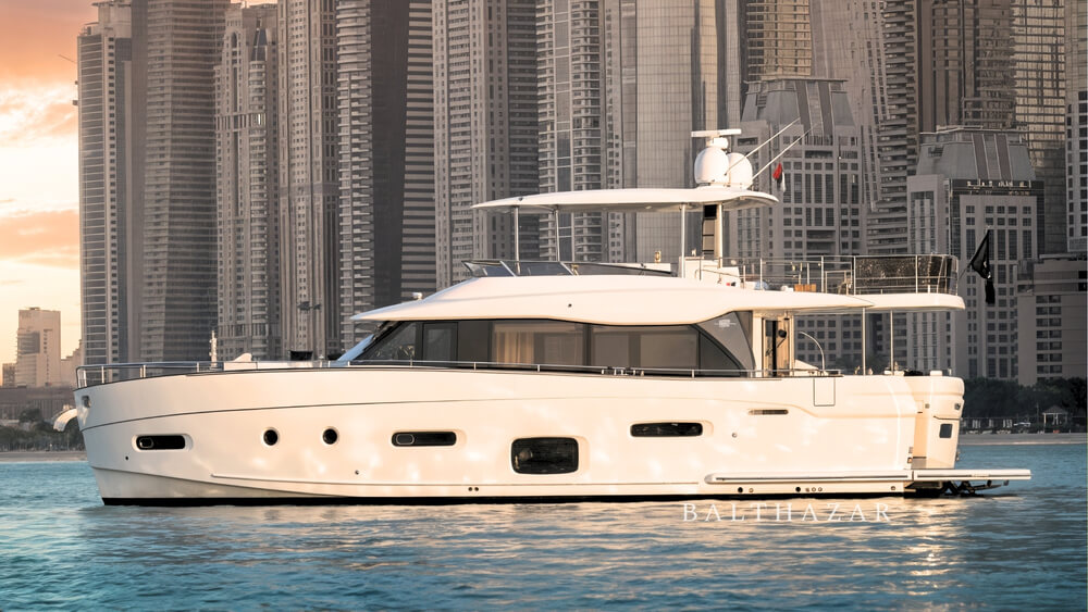 A retractable roof and expansive windows bathe the cabin in light, seamlessly connecting guests to the surrounding seascape. Inside, an open-plan lounge flows effortlessly to the aft deck, offering space for social gatherings, relaxed cruising, or simply soaking up the horizon. With a large swim platform and hidden garage for water toys, it invites adventure at every turn.